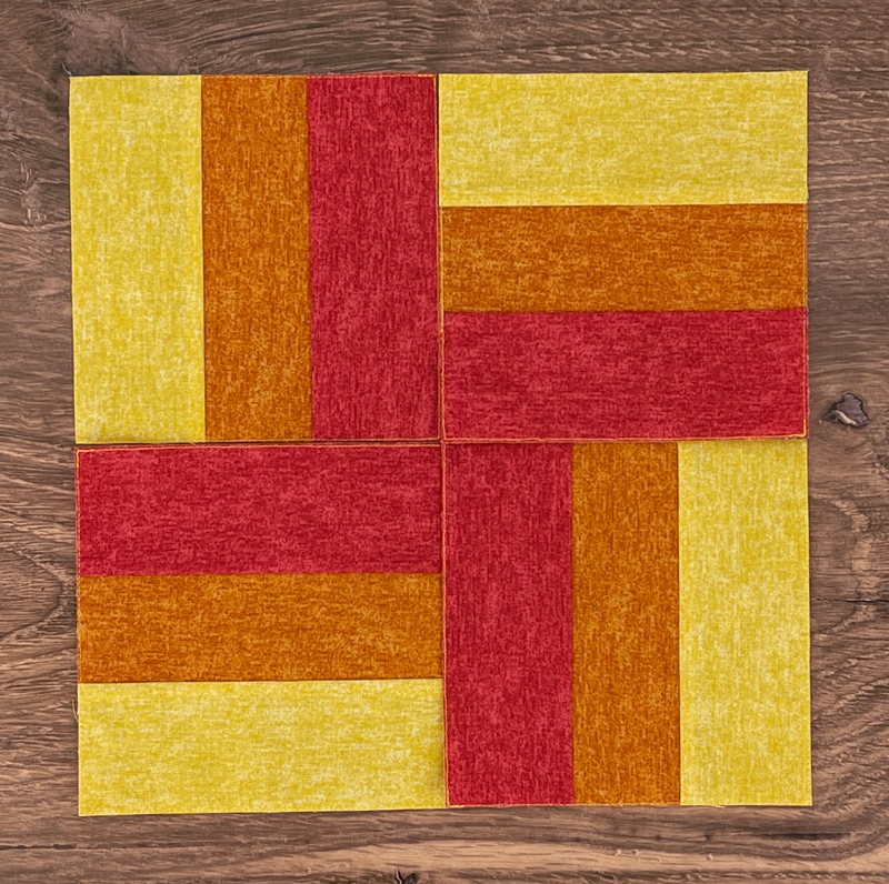 Lay out the Rail Fence blocks as shown. Stitch the Rail Fence blocks together a 1/4” away from the stay stitch line. The completed block will be 9 1/2” x 9 1/2” when sewn together.